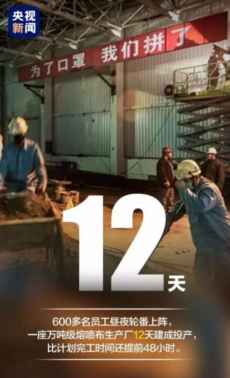 燕山石化2条熔喷无纺布生产线和3条纺粘布生产线,参建各方600多名员工12昼夜连续奋斗建成投产。12天建起一座熔喷布生产厂——这是继10天建成火神山医院、9天实现日产医用防护服4万套后,燕山石化人用“为了口罩,我们拼了!”的大无畏态度,不负众望、不辱使...