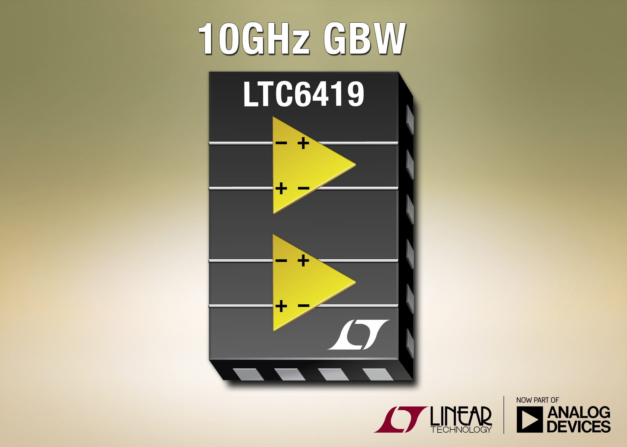 加利福尼亚州米尔皮塔斯 (MILPITAS, CA) 和马萨诸塞州诺伍德 (NORWOOD, MA) – 2017 年 3 月22 日 – 亚德诺半导体 (Analog Devices, Inc.,简称 ADI) 旗下凌力尔特公司推出 10GHz 增益带宽积双差分放大器 LTC6419,该器件具非常低的 1.1nV/√Hz 输入电压噪声密度,因而能够为宽带信号放大提供卓越的 SNR 性能。此外,LTC6419 是低失真的,在 100MHz 时提供 85dB 无寄生动态范围 (SFDR),同时驱动 2VP-P 信号。用 4 个外部电阻器设置每个放大器的差分增益,可配置范围从单位增益和频率响应超过 1GHz、增益为 100 和 100MHz 带宽直到最大增益为 400 和 30MHz 带宽。在这些较高频率上,与其他相似类别的双路放大器相比,LTC6419 提供好得多的 95dB 通道至通道隔离度。另外,其宽 DC 共模电压范围 (输入端为 0V 至 3.5V,输出端为 0.5V 至 3.5V) 使该器件在连接两个不同 DC 电平的 DC 耦合应用中尤其有用,例如从一个 I/Q 调制器的输出到多个模数 (A/D) 转换器的输入。