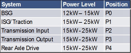 由于BSG的插入点位于发动机的前端附件驱动(FEAD)处,因此BSG的功率级别是最小的,其中转矩的传输必须通过钢带连接。由于其通过钢制齿轮耦合,所以底盘的其余插入点(P2-P4)都具有更高的功率水平。另外,更高功率的机器具有能够为ICE提供牵引辅助的附加功能。这意味着除了由ICE提供的动力之外,电动力源还也能够提升汽车的加速度。在某些配置下,可以想象在ICE关闭的情况下,汽车单靠电动力源即可开动。这取决于电机可用的牵引辅助量及其在底盘子系统中的位置。