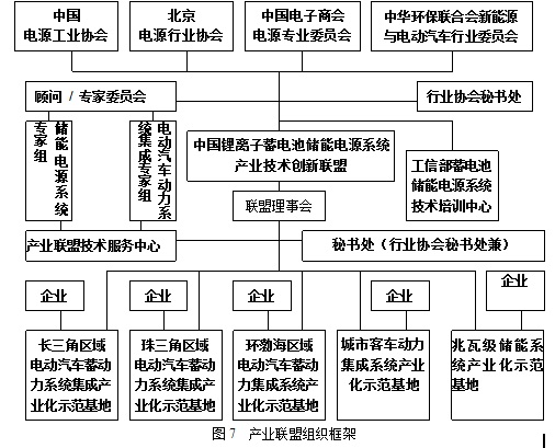 根据《规划》“根据产业政策积极引导地方和社会投资,既要鼓励积极性高、具备一定条件的企业从事新能源汽车及零部件生产,又要防止一哄而起,避免低水平盲目投资和重复建设”;“重点建设京津、珠三角、长三角地区动力电池产业聚集区域”;“培育形成若干具有较强国际竞争力的节能与新能源汽车整车和关键零部件企业集团”; “重点支持形成若干家具有较强国际竞争力的关键零部件企业集团”的精神,拟在产业联盟的框架内,首先在长三角、珠三角和环渤海地区,依托相关企业建设3个“蓄电池储能电源系统”和“纯电动乘用车动力集成系统”区域性产业化基地。依托相关企业建设1个商务客车动力集成系统产业化基地。组织机构如图7。