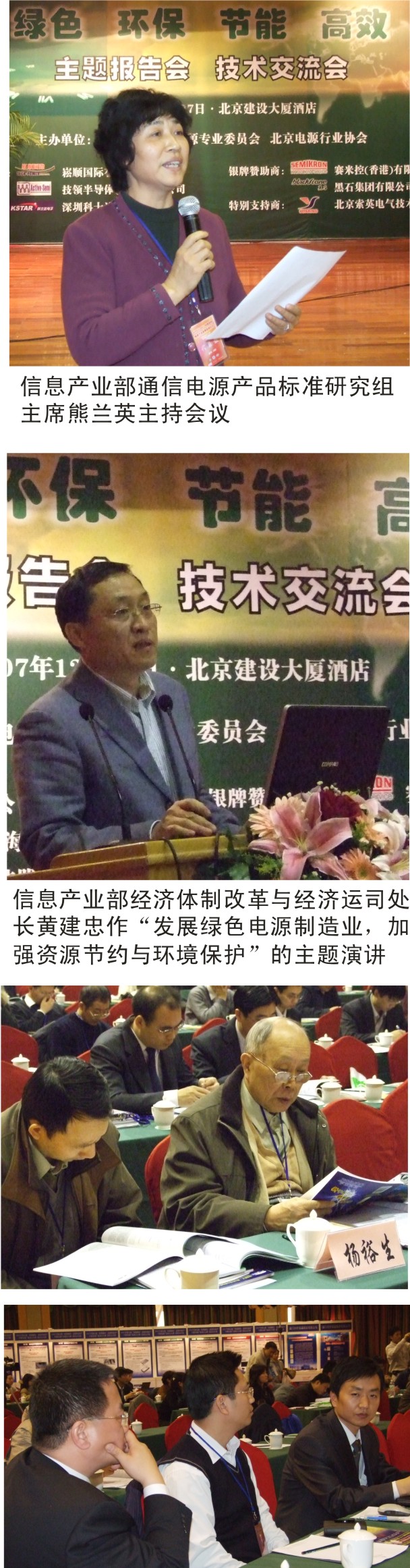 2007年12月27日中国国际电源产业高峰论坛主题报告、技术交流会在北京建设大厦酒店隆重召开,论坛围绕“绿色、环保、节能、高效”的主题,政府主管部门、电源企业的领导与专家们共同探讨电源技术、市场发展与环境能源关系的重要议题。信息产业部通信电源产品标准研究组主席熊兰英主持了会议。
