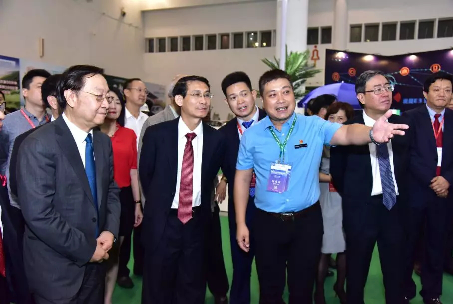 10月20日,振威展览股份董事长张学山(左一)陪同海南省人民政府省长沈晓明(左三)一行参观第三届海南新能源车展