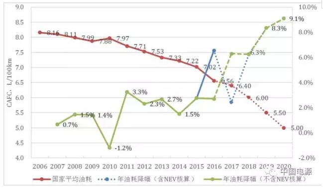 2016年中国进入油耗四阶段管理,企业平均油耗核算方法发生了变化,新方法给予了新能源汽车非常大的核算优惠,其中,产量上一辆新能源汽车可抵五辆传统车,油耗上新能源汽车按零来计算,如此核算,大幅拉低了一些生产新能源汽车企业的油耗水平,国家平均油耗的“核算”结果也因此下降了7%。但若除去新能源汽车的核算影响,传统汽车平均油耗只不过下降了1.7%。依靠核算方法改变,引入新能源汽车带来了超过5%的油耗下降,但实际节能并非如此。
