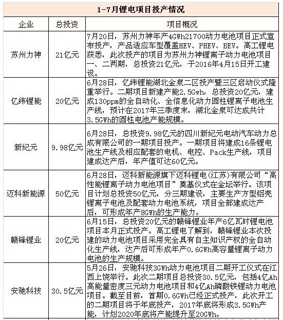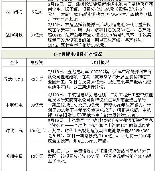 据高工锂电不完全统计,1-7月动力电池投产金额超180亿元,投产企业包括苏州力神、亿纬锂能、四川新纪元、迈科新能源、赣锋锂业、安驰科技、四川浩海、猛狮科技等。而扩展产能计划总投资超410亿元,扩产企业包括宁德时代、微宏动力、猛狮科技、远东福斯特、远东福斯特、银隆、青岛力神、国轩高科、苏州宇量、时代上汽、中航锂电、五龙电动车等。