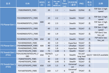 安森美半导体的IGBT技术处于行业领先地位,已从最早的穿通型(PT)、非穿通型(NPT)发展到了现在的场截止(FS)平面及沟槽工艺。FS IGBT的特性及性能为:低导通和开关损耗;正温度系数便于并联运行;最大结温 : Tj=175degC;紧密的参数分布;大的安全工作区域(SOA)。目前安森美半导体的第三代场截止(FSIII)工艺的产品性能已接近行业顶尖水平,并将于2018年开始研发FSIV工艺。