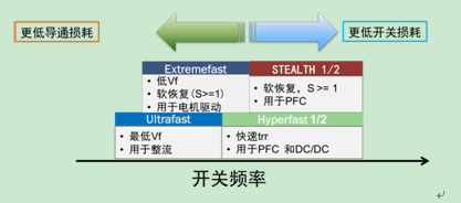 根据不同的应用,整流器可选择更低导通损耗或更低开关损耗的产品,各类产品的主要特点及应用如图2所示。