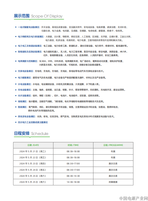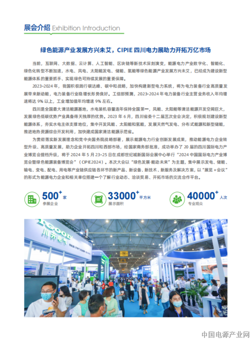 导语:为贯彻落实新发展理念和党中央国务院战略部署,展示能源电力行业创新发展成果,推动能源电力企业转型升级、高质量发展,助力企业开拓四川和西部市场,经国家商务部批准,成功举办了 20 届的四川国际电力产业博览会提档升级,将于 2024 年 5 月 23-25 日在成都世纪城新国际会展中心举行“2024 中国国际电力产业博览会暨绿色能源装备博览会”(CIPIE2024)。本次大会以“绿色发展·能动未来”为主题,集中展示发电、储能、输电、变电、配电、用电等产业链供应链各环节的新产品、新设备、新技术、新服务及解决方案,以“展览 + 会议”的形式为能源电力企业和相关单位搭建一个了解行业动态、洽谈贸易、开拓市场的交流合作平台。