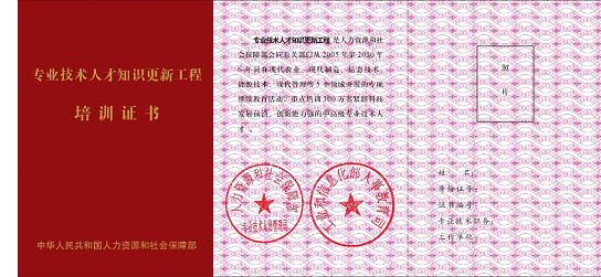 1) 中华人民共和国人力资源和社会保障部统一印制的专业人才技术更新工程——电源系统工 程师培训证书。