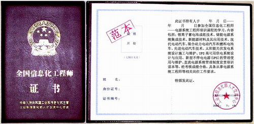 2) 中华人民共和国工业和信息化部人才交流中心统一印制的全国信息化工程师(NCIE)——电源系统工程师证书。