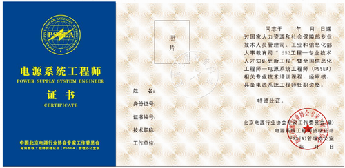 电源系统工程师证书是配合国家“653工程”、 全国信息化工程师培训项目,由北京电源行业协会专家工作委员会统一印制的电源行业职业资格证书,该项目已被民政局批准列入“社会组织服务民生行动”活动。可作为专业技术人人员岗位聘用、任职、定级和晋升职务的重要依据。