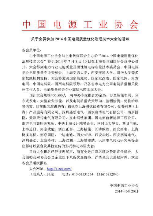 关于会员参加2014 中国电能质量优化治理技术大会的通知